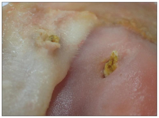 In almost 75% of the study sample (n = 89 animals), focal/multifocal mucosal alterations of the oesophagus were detected (Figure 4 and Figure 5), characterised by white-yellowish elevated plaques of varying number and size. For 82 of these animals, histological examination revealed partially overlapping inflammations with erosive (n = 1), ulcerative (n = 61), necrotising (n = 33), pustular (n = 36) and granulomatous (n = 2) character. Additional findings included epithelial hyperplasia (n = 4) and hyperkeratosis (n = 2). For the remaining seven Common Eiders, macroscopically visible lesions resembled those of the other animals, but due to the size and focal distribution of the lesions, no histological characterisation was possible.