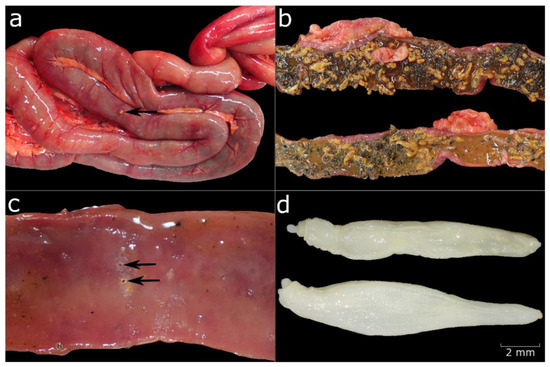 (a) Parasite infection of the small intestine with granulomatous enteritis visible on the serosa (black arrow). (b) Bright orange parasites in the intestine. (c) Ulcerative lesions in the mucosa (black arrows). (d) Profilicollis botulus under the stereomicroscope.