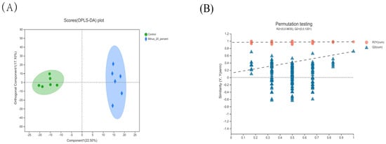 OPLS-DA score plot and OPLS-DA model validation diagram for metabolomics data in longissimus thoracis muscle of Shaziling pigs (n = 6). (A) OPLS-DA score plot of LTM metabolites (control vs. −20%). (B) OPLS-DA model validation diagram.