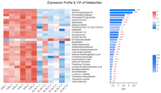 Heatmap of top 30 differential metabolites in longissimus thoracis muscle between the control group and −20% group (n = 6). CON = control, M_20_p = −20%. Significance levels were marked as * for p < 0.05, ** for p < 0.01, and *** for p < 0.001.