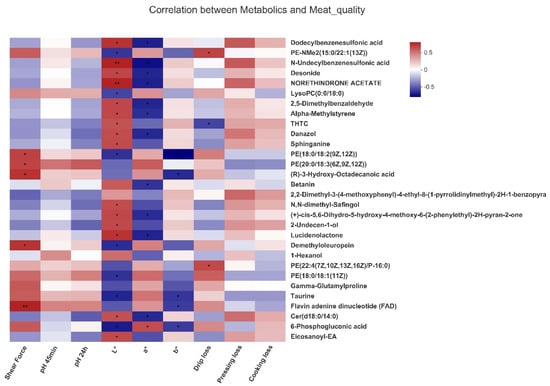 Correlations between longissimus thoracis muscle metabolites and meat quality traits (−20% group, n = 6). The top 30 metabolites were selected. Significance levels were marked as * for p < 0.05, ** for p < 0.01.