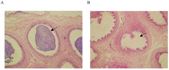 Histological examination of the epididymis in yaks and cattle-yaks. Magnification: 40× (images (A,B)). (A) Sections of HE-stained yak epididymis. (B) Sections of HE-stained cattle-yak epididymis. The arrow points to the epididymal canal.