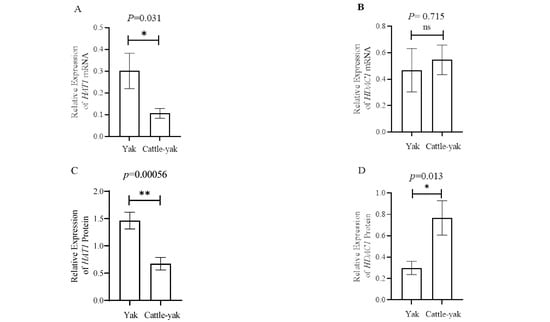 The expressions of HAT1 and HDAC1 proteins in testes were tested by Western blot (Figure 2C,D), and GAPDH was used as the reference. The results showed the expression of HAT1 in yaks was significantly higher (p < 0.01) than in cattle-yaks, while for HDAC1, the expression in yaks was significantly lower (p < 0.05) compared to cattle-yaks.