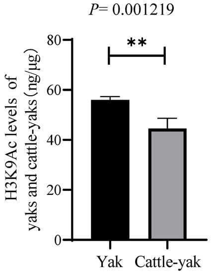 The ELISA results showed that the acetylation level of H3K9 was decreased in the testes of cattle-yaks compared with yaks (p < 0.01) (Figure 3).