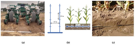 (a) Mechanized seeding, rear view on one of the headers of the field; (b) schematic view (top and transverse) of the subsurface drip irrigation system (SDI); (c) soil profile with the irrigation line at 0.25 m depth.