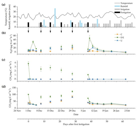 The DE treatment had the highest N2O fluxes (68.5 µg N2O-N m−2 h−1), followed by the U (23.5 µg N2O-N m−2 h−1) and C (16.8 µg N2O-N m−2 h−1) treatments (Figure 3b). A delayed N2O peak was observed from the DE treatment in both of the frequently measured periods (first and last fertigation), whilst the U treatment only showed an N2O peak on the last fertigation occasion. From day 44 onwards, one week after the last fertigation, there were no statistically significant differences between treatments.