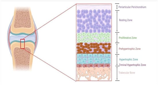Each growth plate is a multilayer sandwich structure organized into four distinct zones: reserve, proliferating, transformational, and degeneration zones [40]. Immature cells in the growth plate are included in the resting zone because they are located near the epiphysis. This zone comprises tiny, homogeneous, compactly placed chondrocytes that appear alone or in couples and are positioned inside the reserve zone (also called resting or germinal area). This zone is further distinguished by a low proliferation rate, proteoglycan, and collagen type II production [41,42]. The proliferating zone is the next layer down from the reserve area. Chondrocytes are flattened and well-separated into columns in this area. During mitosis, cells only divide at the bottom of a column. Collagen production in the true germinal layer has risen significantly in type II and type XI [43]. The transformation zone, which lies beneath the proliferative zone, is divided into a top and bottom hypertrophic zone and a degenerative zone. Chondrocytes at this stage are distinguished by their lack of cellular proliferation and decreased DNA synthesis [15,43].