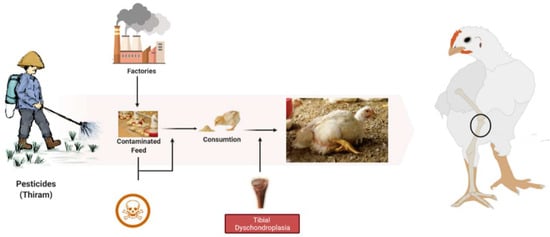 Pesticides are widely used in agriculture to eradicate or control many agricultural bugs, herbicides, and diseases that may harm crops and animals. On the other side, pesticides have become a hazard due to their toxicity. Living organisms may be exposed precisely or periphrastically over the food chain, air, soil, and water [18]. Thiram (Tetramethyl thiuram disulfide) is a dithiocarbamate pesticide and fungicide commonly used in horticulture to treat grains for seed protection and preservation [19]. It has a lipophilic character that can effortlessly combine with cell membranes to induce cytotoxicity, bone formation problems, cartilage damage, and immunological downturns. It may also cause membrane disruption, bone biosynthetic pathway inactivation, and angiogenesis inhibition [20]. So, it is highly associated with the induction of TD, with symptoms that resemble commonly occurring tibial dyschondroplasia. Additionally, earlier research has shown that TH (thiram) may cause TD in chickens at the dose rate of 50 mg/kg [5,21]. Moreover, it has been frequently mobilized to imitate TD in numerous research trials [22,23,24,25]. Our prior studies indicate that thiram induces apoptosis in chondrocytes raising the number of apoptotic chondrocytes inside the osteogenesis area [26,27,28]. Besides, thiram inhibits angiogenesis within the GP, reducing chondrocytes function and osteogenesis [29]. Among thiram’s most visible and damaging effects is a bone cartilage disorder in broilers when fed thiram-containing diets [24,29]. During this disorder, non-mineralized avascular cartilage accumulates in the growth plates of the proximal tibia, resulting in lameness [30].