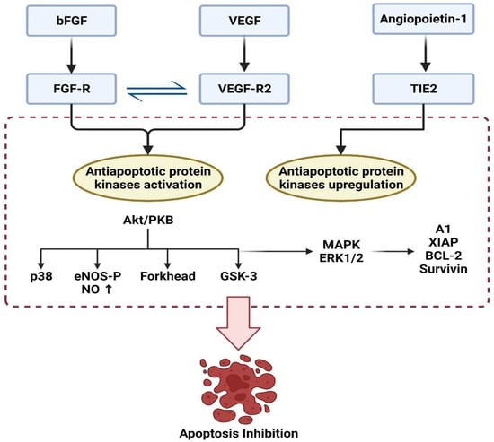Angiogenesis is the process through which new capillaries develop from pre-existing vessels under different growth factors [61]. Almost all cells survive due to growth factors and interaction with the extracellular matrix. The depletion of growth factors, including VEGF, bFGF, and angiopoietin-1, may cause uncontrolled apoptosis. So, their activation has been shown to promote survival by blocking apoptosis [62]. The action of VEGF is transduced by two tyrosine kinase receptors, flt-1, and flk-1. Cell multiplication and survival have been linked to flk-1, whereas chemotaxis and vascular permeability have been linked to flt-1 [62]. The protein kinase B (or Akt) and MAPK are parts of the flk-1-activated signaling pathway [62,63]. Moreover, VEGF has been demonstrated to enhance cell survival by activating the PI3K/Akt pathway [61,64]. Surprisingly, VEGF’s survival function relies on VEGF binding to VEGFR2 (KDR/flk-1) [64]. Hence, VEGFR2 and PI3K/Akt signal transduction pathways are critical in VEGF-induced survival enhancement. Furthermore, Akt-dependent stimulation of endothelial nitric oxide synthase (NOS) results in increased endothelial NO production, which is one of the downstream effector mechanisms, mediating the antiapoptotic VEGF action [65,66]. Alternatively, the PI3K/Akt pathway promotes survivin transcription and can suppress the p38 mitogen-activated protein kinase (MAPK) [67,68]. The VEGF induces MAPK/ERK pathway stimulation and suppresses the stress activated protein kinase/c-Jun amino-terminal kinase pathway, which is implicated in the antiapoptotic action mediated by VEGF. Interestingly, activation of the PI3K/Akt pathway mediates the survival impact of VEGF on cells and the migrating effect of VEGF via Akt-dependent phosphorylation and eNOS activation [69] (Figure 4).