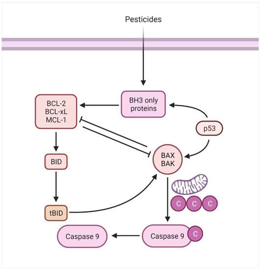 Apoptosis participates in the development, regeneration, and integrity of multicellular organisms. It is critical to multiply, eliminate and maintain homeostatic physiological functions during the transformation, development, and tissue renewal processes [70]. This natural cell death process is genetically predetermined and involves the destruction of cells in response to specific signals under different mediators (Table 1) [71]. However, if this common cell death mechanism fails, the effects might be disastrous. This entire mechanism is interconnected to multiple conserved anticlines. It terminates for stimulating and destroying cellular inputs [72] in different growth plate zones under the effect of pesticides, e.g., thiram. Typically, programmed cellular senescence is regulated by a range of intra and extracellular signals guided by the cell’s surroundings and internal signaling [73]. It has been shown that some proteins hold both pro and anti-apoptotic functions in the cell, which plays a pivotal part in the governance of apoptosis [74]. The apoptosis inducer, mediator, and executioner genes are regularly transduced into those cells to compensate for the absence of the endogenous homologue [75]. Moreover, several factors contribute to the effectiveness of molecular-targeted specific medications; understanding these factors offers insight into an effective treatment plan for designing molecular-targeted medicines [70].