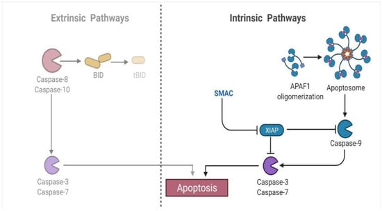 - Kashyap, D.; Garg, V.K.; Goel, N. Intrinsic and extrinsic pathways of apoptosis: Role in cancer development and prognosis. In Advances in Protein Chemistry and Structural Biology; Elsevier: Amsterdam, The Netherlands, 2021; Volume 125, pp. 73–120. [Google Scholar]