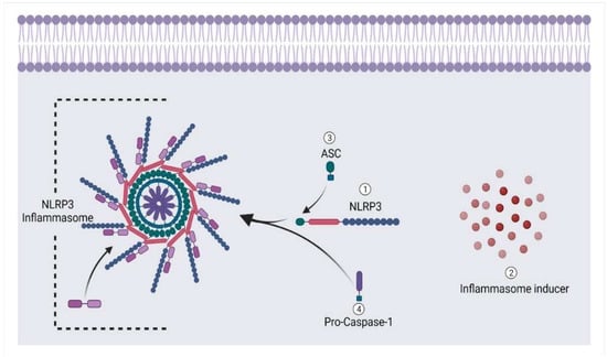 An NLRP3 base inflammasome seems to be a critical part of the innate immunity that various stimuli may trigger. It incorporates NLRP3, an apoptosis-associated speck-like protein with a CARD (ASC), and pro-Caspase-1 [115] (Figure 8). Nevertheless, Caspase-1 is notorious for generating pyroptosis and was first discovered to activate apoptosis under beta cell lymphoma 2 (Bcl-2) inhibition [116]. Moreover, it is involved in apoptosis in several clinical situations [117]. It has recently been discovered that NLRP3 inflammasomes are formed due to intrinsic apoptosis [118,119]. The Caspase-3 and Caspase-7 break down the membrane protein pannexin1 during apoptosis. This helps free pannexin1 channel activity from self-inhibition caused by its cytoplasmic C-terminal tail. After cleaving these executioners, pannexin 1 sends K+ out of the cell to activate the NLRP3 inflammasome, which in turn produces IL-1β [120]. So, the NLRP3 base inflammasome has much importance in bone-related disorders. According to research by Kin et al., patients experiencing arthritis had increased expression of the NLRP3 inflammasome, which was associated with elevated pro-inflammatory mediators [121] (Figure 7). Another study by Pan et al. found that nucleosides, including nucleoside analogues, may stimulate host immune responses in mice with type II collagen-induced arthritis by interacting with TREM receptors on the skin and NLRP3 inflammasomes [122]. As a result, combining these pro-inflammatory cytokines may result in phenotypic alterations in cells throughout the ossification process [115,123].