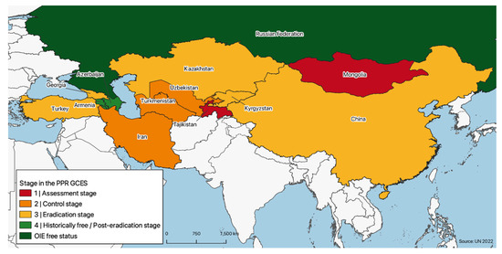 The variability in terms of PPR presence is reflected by differences in the surveillance and control efforts put in place by different countries, which in turn result in countries being at different stages of the PPR GCES stepwise approach, ranging from stage 1 to official PPR freedom status (post stage 4) (Figure 3).