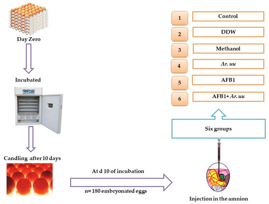 Pure Aflatoxin B1 (AFB1) brushed from Sangon Biotech, Shanghai Co., Ltd. (Shanghai, China), (98% AFB1, catalogue no. A606874-0005) was dissolved with methanol (20%) to obtain final concentrations of 50 ng AFB1/10 μL. The AFB1 level was determined using an AFB1 ELISA Kit, product number: MM-1911O1, Romer Labs, Union, CN. At day 10 of incubation, eggs (n = 180) 58.6601 ± 2.6105 were randomly divided into six groups (30 eggs/group) using the YMC scale (METTLER instruments, YMC, Co., Ltd., Tokyo, Japan). A 21-gauge needle with a small, beveled tip was used to inject the eggs into the air cell, reaching for the amnion. Pilot testing using a visible dye before the injection indicated the solutions were safely delivered into the amnion. The 1st group served as a control (non-injected eggs), the 2nd group was only injected with 10 μL double-distilled water (DDW), the 3rd group was injected with 500 µL Methanol, the 4th group was injected with 500 µL of a freshly prepared solution of 0.01 g of Ar. uu., the 5th group was injected with 10 μL Methanol 20 containing 50 ng AFB1 (AFB1 group), and the 6th group was injected with 50 ng AFB1 + 500 µL of 0.01 g Ar. uu (Figure 1).