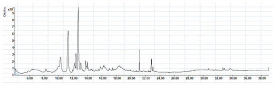 Gas chromatography (Agilent 7000C GC/MS Triple Quad, Santa Clara, CA, USA) equipped with an HP-5MS column (length = 30 m; diameter = 0.25 mm; film thickness = 0.25 m) mass spectrometer programmed at temperature 30–280/300 °C with a hold time of 5 min and rate of 10 °C/min was used to investigate bioactive compounds in methanol extract of dried Arctostaphylos uva-ursi. The chromatography conditions were as follows: column flow rate of 1 mL/min, injection mode split, and carrier gas Helium 99.999%. GC-MS spectra with mass library search (National Institute of Standards and Technology, Bureau Drive Gaithersburg, MD, USA, based AMDIS software) and relative retention indices were used to identify the components [42].