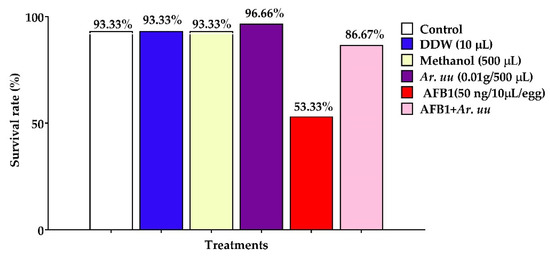 The current study demonstrated that the mortality rates were augmented in the groups treated with AFB1 compared to the control group. The hatchability rate in this study was decreased in the groups treated with AFB1. Khan et al. [60] determined that in ovo administration of AFB1 by embryo results in significant mortalities, embryonic malformations, and production of chicks with deficient immune systems. Aydin et al. [61] reported that in ovo administered aflatoxin Bl declined hatching weight in a dose-dependent manner. Oznurlu et al. [17] illustrated that in ovo administered AFB1 negatively affected the embryonic growth and development of the bone tissue. Thus, the results exhibited that Ar. uu. injection reduced the AFB1 negative effects on the development of the embryo.