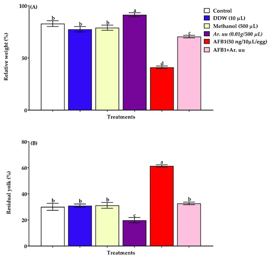 (A,B). Effect of Arctostaphylos uva-ursi fruit methanolic extract and/or AFB1 in ovo injection on checks relative weight and residual yolk relative weight of broiler chicks on 21 days of incubation (n = 15). Control = non-injected eggs, DDW = Eggs injected with 10 μL DDW, Methanol = eggs injected with 500 µL Methanol, Ar. uu. = Eggs injected with 500 µL of a freshly prepared solution of 0.01 g of Ar. uu., AFB1 = Eggs injected with 10 μL DDW containing 50 ng AFB1, and AFB1 + Ar. uu. = Eggs injected with 10 μL DDW containing 50 ng AFB1 + 500 µL containing 0.01 g Ar. uu. a–d Values within columns with different letters significantly (p < 0.05) differ.