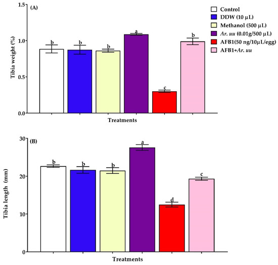 (A,B). Effect of Arctostaphylos uva-ursi fruit methanolic extract and/or AFB1 in ovo injection on checks relative tibia weight and tibia length of broiler chicks on 21 days of incubation (n = 15). Control = non-injected eggs, DDW = Eggs injected with 10 μL DDW, Methanol = eggs injected with 500 µL Methanol, Ar. uu. = Eggs injected with 500 µL of a freshly prepared solution of 0.01 g of Ar. uu., AFB1 = eggs injected with 10 μL DDW containing 50 ng AFB1, and AFB1 + Ar. uu. = Eggs injected with 10 μL DDW containing 50 ng AFB1 + 500 µL containing 0.01 g Ar. uu. a–d Values within columns with different letters significantly (p < 0.05) differ.