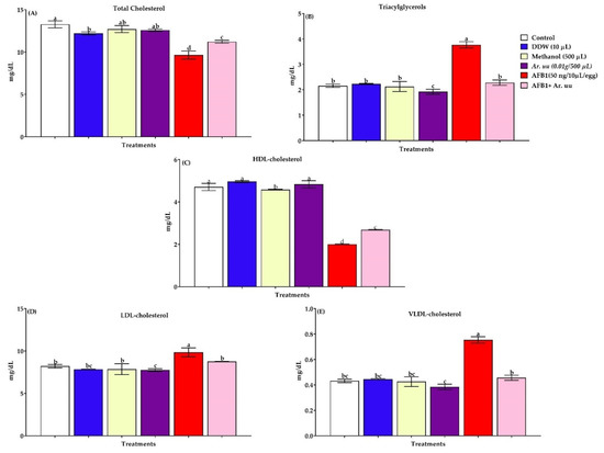 Serum lipid profiles (triacylglycerols, cholesterol, LDL-cholesterol, HDL-cholesterol, and VLDL-cholesterol) of new hatched broilers chicks exposed to AFB1 during incubation are displayed in Figure 6A–E. Results illustrated that AFB1 in ovo injection increased triacylglycerols and bad cholesterol indices (VLDL and LDL) compared to the control group. However, the injection of Ar. uu. recovered the adverse influences of AFB1 in ovo injection by reducing bad cholesterol levels and increasing HDL levels as good cholesterol.