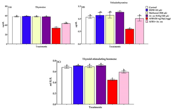 Serum thyroid activity of newly hatched broilers chicks exposed to Arctostaphylos uva-ursi fruit methanolic extract and/or AFB1 during incubation is shown in Figure 7A–C. The changes in thyroxin, triiodothyronine, and thyroid-stimulating hormone indicated that AFB1 in ovo injection led to markedly decreased thyroid gland activity by 41.74, 44.33, and 34.41%, respectively, compared to the control group. However, the co-injection with Ar. uu. + AFB1 enhanced thyroid function by 29.19, 71.18, and 32.88%, respectively, compared with AFB1 alone.