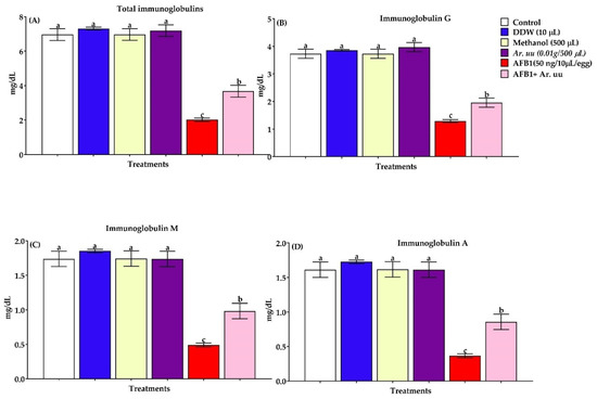 Total immunoglobulins and immunoglobulins fractions determined in the serum were shown in Figure 8A–D. Results indicated that the in ovo injection of AFB1 leads to downregulation of immunoglobulins and its fraction by 70.97, 65.41, 71.67, and 77.39%, respectively, compared with other groups. Contrarily, the in ovo injection of Ar. uu. + AFB1 recovered the harmful effects of AFB1 to be nearest the control group and better than the AFB1 group alone by 81.68, 51.16, 100.81, and 135.71% of total immunoglobulins, IgG, IgM, and IgA, respectively. Moreover, there were no significant differences among the control, DDW, Methanol and Ar. uu. groups.