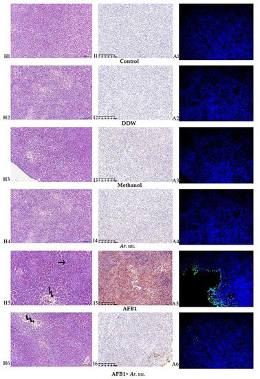 (H1–A6). Effect of Arctostaphylos uva-ursi fruit methanolic extract and/or AFB1 in ovo injection on the spleen histology (H1–H6) and immunohistochemistry (I1–I6) and spleen apoptosis examination (A1–A6). Control = non-injected eggs, DDW = Eggs injected with 10 μL DDW, Methanol = eggs injected with 500 µL Methanol, Ar. uu. = Eggs injected with 500 µL of a freshly prepared solution of 0.01 g of Ar. uu., AFB1 = eggs injected with 10 μL DDW containing 50 ng AFB1, and AFB1 + Ar. uu. = Eggs injected with 10 μL DDW containing 50 ng AFB1 + 500 µL containing 0.01 g Ar. uu.