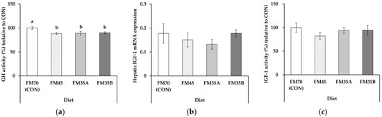 Growth-related factors of olive flounder (Paralichthys olivaceus) fed experimental diets for five months (n = 10). (a) Plasma GH activity; (b) hepatic IGF-1 mRNA expression; (c) plasma IGF-1 activity. FM70 (CON), 70% fishmeal diet; FM45, 45% fishmeal diet; FM35A, 35% fishmeal diet; FM35B, 35% fishmeal + 3.5% insect meal + 0.5% insect oil diet. Different letters above the bars indicate significant differences at p < 0.05.