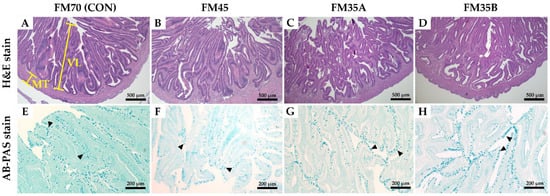 Histological structure of the intestine of olive flounder (Paralichthys olivaceus) fed experimental diets for five months. VL, villus length; MT, muscular thickness; goblet cell (black arrowhead) are shown. Representative micrographs of H&E stain ((A–D), image magnification, ×40 (scale bar = 500 µm)), AB-PAS stan ((E–H), image magnification, ×100 (scale bar = 200 µm)).