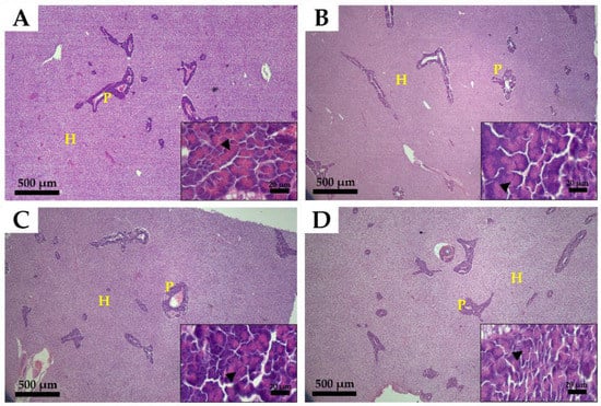 Histological structure of the liver of olive flounder (Paralichthys olivaceus) fed experimental diets for five months. (A), 70% fishmeal diet; (B), 45% fishmeal diet; (C), 35% fishmeal diet; (D), 35% fishmeal + 3.5% insect meal + 0.5% insect oil diet. P, pancreas; H, hepatocyte; zymogen granules (black arrowhead) are shown. Main image magnification, ×40 (scale bar = 500 µm); inset image magnification, ×1000 (scale bar = 20 µm).