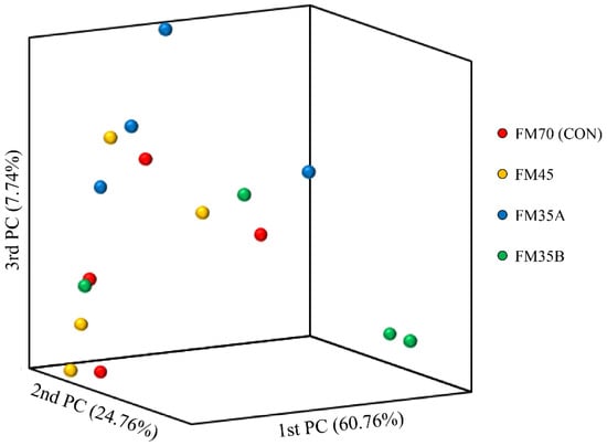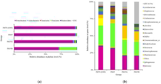 The most abundant phylum in all diet groups was Proteobacteria. Unlike other groups, including CON, the FM35B group contained a high proportion of Firmicutes. At the genus level, Ralstonia and Sphingomonas were abundant in all groups. Notably, Vibrio was most abundant in the CON group (Figure 5).
