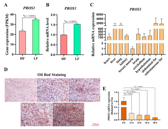 PROS1 was downregulated in high-fat chicken. (A) The gene expression difference of PROS1 in abdominal fat tissues between high-fat chicken and low-fat chicken shown in our previous RNA-seq. (B) The mRNA expression difference of PROS1 between high-fat chicken and low-fat chicken was detected by qRT-PCR. (C) PROS1 expression profile in different tissues. (D) The oil red O staining of ICP-1 cells treated with differentiation induction at different time points. (E) The PROS1 mRNA expression in ICP-1 cells treated with differentiation induction at different time points. The results are all presented as means ± SEM, * p < 0.05.