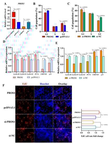 PROS1 facilitates chicken preadipocyte proliferation. (A) The overexpression efficiency or knockdown efficiency of pcDNA3.1-PROS1 or si-PROS1. (B,C) The flow cytometry analysis of ICP-1 treated with PROS1 overexpression and knockdown. (D,E) The mRNA levels of cycle-related genes in ICP-1 treated with PROS1 overexpression and knockdown were detected by qTR-PCR. (F) The EdU staining and statistics of ICP-1 treated with PROS1 overexpression and knockdown. The results are all presented as means ± SEM, * p < 0.05.