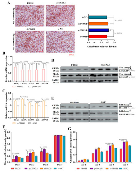 PROS1 inhibits chicken preadipocyte differentiation. (A) The oil red O staining and statistics of ICP-1 after treating with pcDNA.1-PROS1 plasmid and si-PROS1. (B,C) The mRNA levels of preadipocyte differentiation-related genes in ICP-1 treated with PROS1 overexpression and knockdown were detected by qRT-PCR. (D,E) The protein levels of CEBPα and PPARγ in ICP-1 treated with PROS1 overexpression and knockdown were detected by Western blot. (F) The glucose consumption measure during ICP-1 differentiation. (G) The glycerol production measure during ICP-1 differentiation. The results are all presented as means ± SEM, * p < 0.05. Original western blot figures in Figure S1.