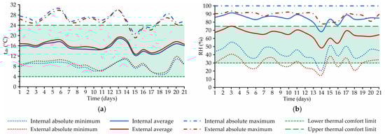 Figure 2 illustrates the daily curves of the mean, absolute minimum, and absolute maximum values of tdb (in °C) and RH (in %), recorded inside and outside the facility.