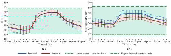 Average hourly profiles of the (a) temperature and humidity index (THI) and (b) specific enthalpy of air (h, in kJ∙kg of dry air−1) throughout the day in the internal and external facility environments, during the experimental period.