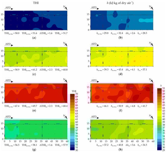 Spatial distribution of temperature and humidity index (THI) and specific enthalpy of air (h, in kJ∙kg of dry air−1): (a,b) dawn (12:00 a.m. to 05:59 a.m.), (c,d) morning (06:00 a.m. to 11:59 a.m.), (e,f) afternoon (12:00 a.m. to 05:59 p.m.), (g,h) and night (06:00 p.m. to 11:59 p.m.). AFD—air-flow direction; N—north indication; THIInt-Min—minimum internal temperature and humidity index; THIInt-Max—maximum internal temperature and humidity index; ΔTHIInt—variation of internal temperature and humidity index; THIExt—mean external temperature and humidity index; hInt-Min—minimum internal specific enthalpy of air; hInt-Max—maximum internal specific enthalpy of air; ΔhInt—variation of internal specific enthalpy of air; hExt—mean external specific enthalpy of air; dimensions in meters (m).