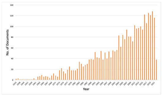 Publication profile of snake venom-related research during the years 1933–2022. A total of 2999 documents were retrieved from the Scopus database. The productivity in snake venom-related research has gradually increased since the 1960s, with the highest number of documents published in 2020.