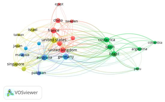 Mapping of country collaboration. Out of 138 countries, 25 published a minimum of 30 documents. The size of the circle is proportional to the number of collaborations with other countries.
