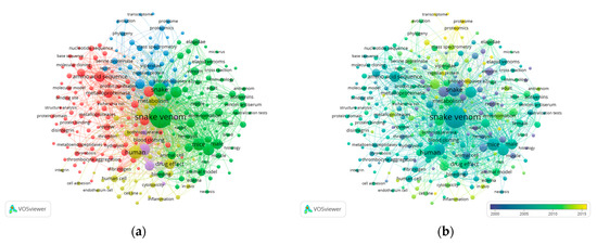 VOSviewer mapping of occurrence terms extracted from titles and abstracts in snake venom-related research articles. (a) network visualization; (b) overlay visualization. The size of the circles is proportional to the frequency of appearances. The length of the link indicates the degree of relationship. With a minimum of 50 occurrences, 255 out of 15,498 terms match the criteria.