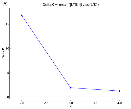 - Pritchard, J.K.; Stephens, M.; Donnelly, P. Inference of population structure using multilocus genotype data. Genetics 2000, 155, 945–959. [Google Scholar] [CrossRef]