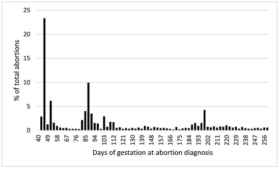 Distribution of abortion incidence by days of gestation at the time of abortion diagnosis.