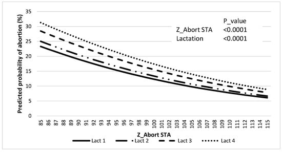 There was an effect of Z_Abort STA (p < 0.0001) and lactation (p < 0.0001) on the predicted probability of abortion, where the latter increased as Z_Abort decreased (Figure 3, and Table 6).
