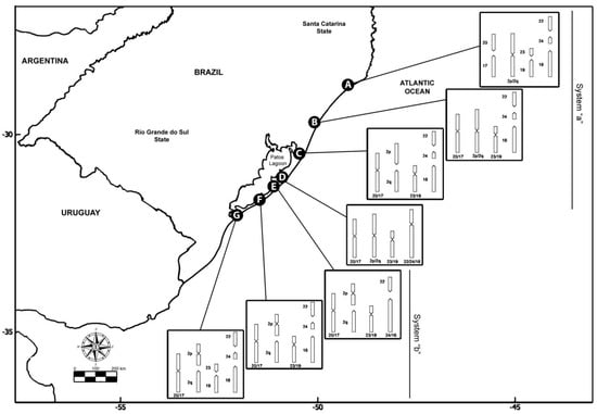 The species C. minutus is restricted to Southern Brazil, inhabiting the sandy fields and dunes of the coastal plains of the states of Santa Catarina and Rio Grande do Sul [34]. It presents a notable chromosomal variation, with 45 different karyotypes (cytotypes) already described, the largest variation detected for the genus so far [31,35,36,37]. Seven parapatric parental karyotypes, here designated as cytotypes A to G, have been identified [31,37,38], with six hybrid zones also documented [29,31,36,37,38,39,40]. The progressive decrease of 2n from 50 to 42 chromosomes involved Robertsonian rearrangements, tandem fusions/fissions, and paracentric and pericentric inversions (Table 1 and Figure 1) [29,31,38,39], which were characterized by G-bands highlighting the chromosomal homologies among cytotypes [29,31,37]. Each cytotype is found in a particular geographic area, and the divergent populations can be separated by geographic barriers or have a contiguous distribution [29].