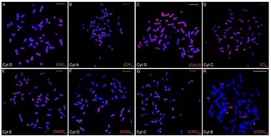 Fluorescence in situ hybridizations with varied microsatellites motifs in the different cytotypes (A–H) of Ctenomys minutus. The sex chromosomes are indicated for each metaphase. Bar = 10 μm.