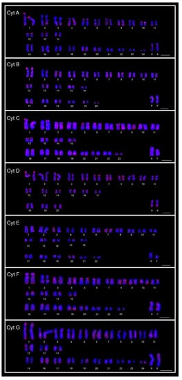 FISH karyotypes of the seven cytotypes (Cyt A–G) of Ctenomys minutus with the A30 motif probe. Bar = 10 μm.