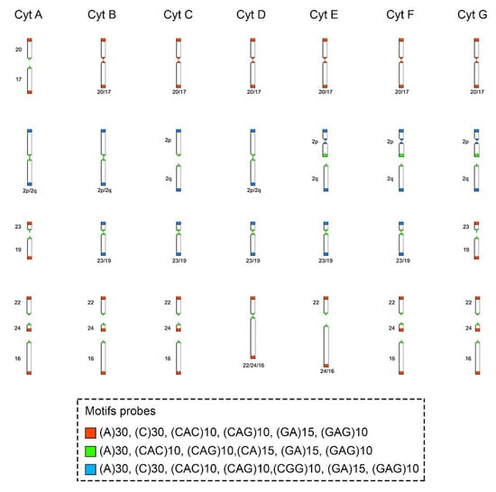 Schematic representation of the hybridization pattern of the microsatellite motif probes on the chromosomes of Ctenomys minutus. Comparison of the chromosomal rearrangements found among the cytotypes (Cyt A–G). The cytotype A was used as a standard to compare the chromosomal rearrangements in the other cytotypes. Modified from Freitas, Freygang et al., and Lopes et al. [29,31,37]. In the fusion 20/17 (line 1), the motifs involved are (A)30, (C)30, (CAC)10, (CAG)10, (GA)15, and (GAG)10 (blocks in red). In the fission of chromosome 2 (line 2), the motifs involved are (A)30, (CAC)10, (CAG)10, (CA)15, (GA)15, and (GAG)10 (blocks in green) and in the inversion in the short arm of chromosome 2 (line 2), the motifs involved are (A)30, (C)30, (CAC)10, (CAG)10, (CGG)10, (GA)15, and (GAG)10 (blocks in blue). In the fusion 23/19 (line 3), the motifs involved are (A)30, (CAC)10, (CAG)10, (CA)15, (GA)15, and (GAG)10 (blocks in green). In different combinations of centric and tandem fusions 22/24/16, the motifs involved are (A)30, (CAC)10, (CAG)10, (CA)15, (GA)15, and (GAG)10 (blocks in green), and (A)30, (C)30, (CAC)10, (CAG)10, (GA)15, and (GAG)10 (blocks in red).
