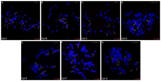 Concerning LINE-1-like repeats, in general, few hybridization signals were observed, with a preferential location in one of the distal chromosomal regions: in five pairs in cytotypes A, F, and G, in four pairs in cytotype B, in three pairs in cytotypes C and E, and in only two pairs in cytotype D (Figure 5A–G).