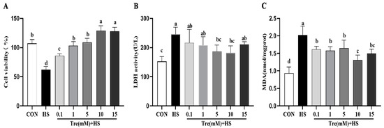 Effects of trehalose on cell viability (A), LDH activity (B), and MDA content (C) in heat-stressed IPEC-J2 cells. IPEC-J2 cells were cultured at 37 °C until the end of the experiment (control, CON); exposed to heat stress for 2 h (43 °C, HS); or pretreated with different concentration of trehalose (0.1, 1, 5, 10, and 15 mM) at 37 °C for 4 h prior to heat stress exposure for 2 h. Data are shown as mean ± SD (n = 3). Means for variables that do not share a common letter differ significantly (p < 0.05).