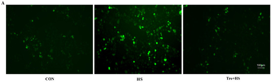 The change in mitochondrial membrane potential (MMP) can be reflected by the ratio of green to red fluorescence intensity. As shown in Figure 4, compared to the CON group, MMP was significantly decreased in the HS group (p < 0.01). However, the Tre + HS group showed a higher level of MMP than that of the HS group (p < 0.01).