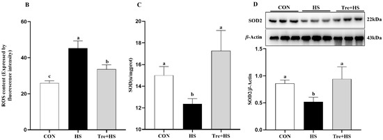 Effects of trehalose on cellular ROS level, SOD activity, SOD2 expression level in heat-stressed IPEC-J2 cells. IPEC-J2 cells were cultured at 37 °C until the end of the experiment (control, CON); exposed to heat stress for 2 h (43 °C, HS); or pretreated with 10 mM trehalose at 37 °C for 4 h prior to heat stress exposure for 2 h (Tre + HS). Cellular ROS accumulation was measured by the DCFH-DA fluorescence analysis (A,B). SOD2 activity (C). Expression level of SOD2 tested by Western blot (D). SOD2: superoxide dismutase 2. Data are shown as mean ± SD (n = 3). Means for variables that do not share a common letter differ significantly (p < 0.05).